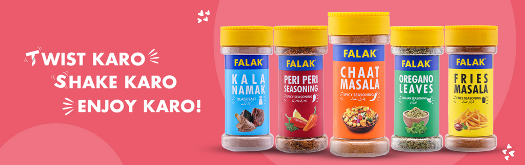 Falak Chaat Masala may be sprinkled on Dahi Baras, Fruit Chaat, Salads, Aloo Cholay, Haleem, Fish and all types of lentils to make you meal extra savoury and chatpata.